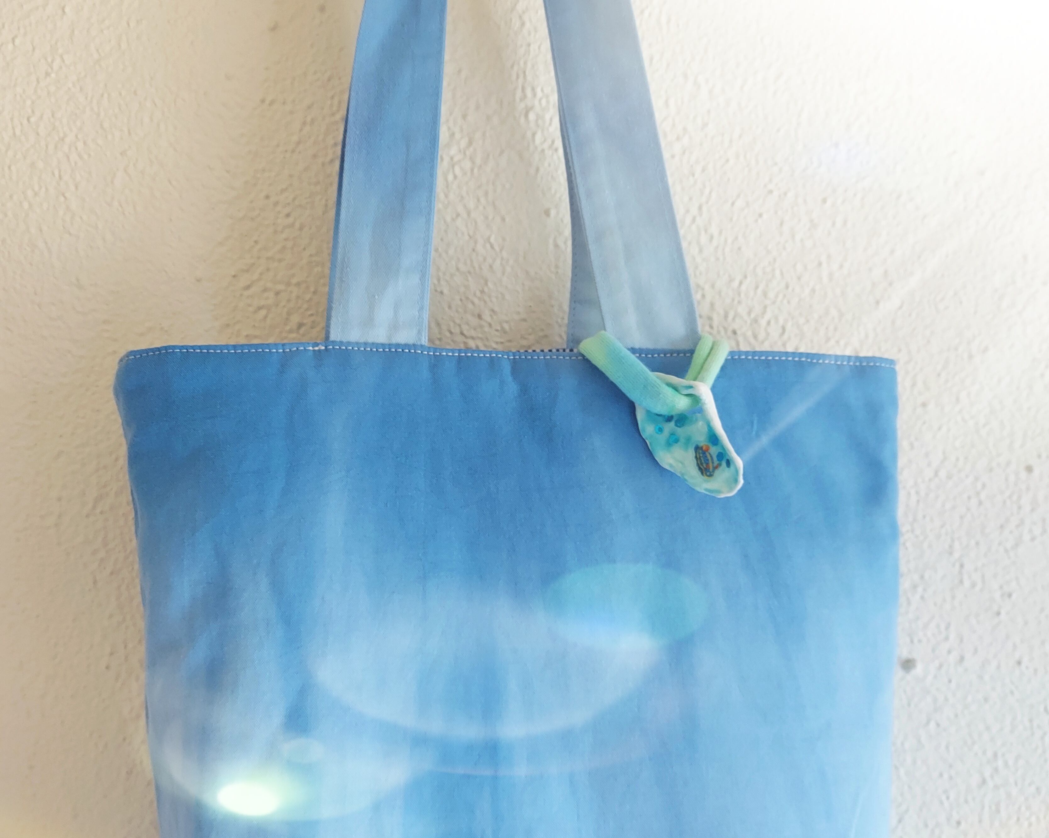 ※持ち手部分とバックの片面には染色生地を使用しております。染めた際に色止め加工はしておりますが、洗剤によっては色落ちする可能性があります。ご心配な方は白地のものとは別に洗濯をお願い致します。